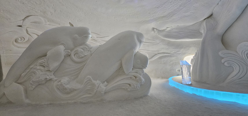 Na het bezoek aan de mijn brengt een autobus ons naar het ICE hotel, zo'n 15 minuten rijden. Hier genieten we van een Lapse lunch en brengen dan een bezoek aan het ijshotel en de talrijke ijssculpturen. Daarna transfer terug naar het hotel en vrije tijd tot aan het avondmaal. En je raadt het al, na de diner staan we weer op uitkijk naar het poollicht.